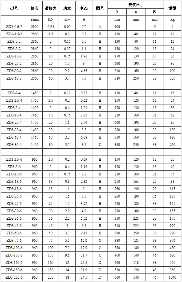 ZDS系列振動(dòng)電機(jī)技術(shù)參數(shù):